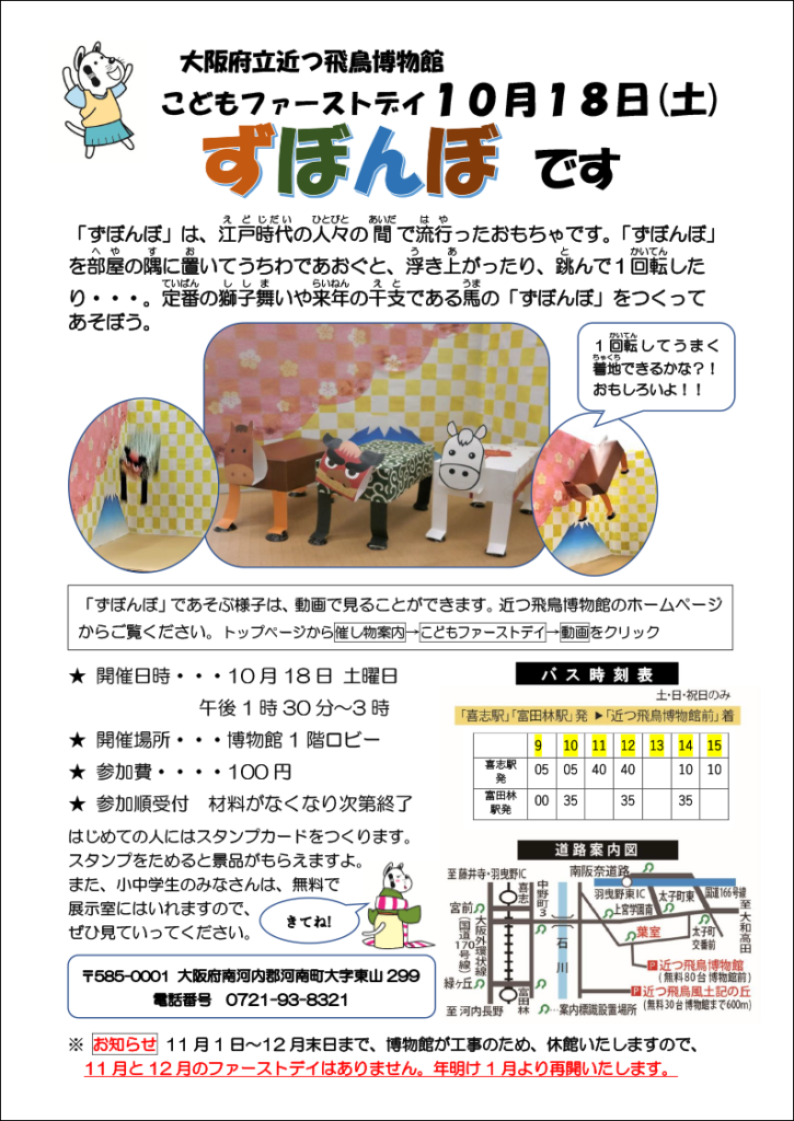 いろいろな工作を楽しみましょう。 工作の内容は毎月替わります。 【時間】13時30分~15時 【場所】博物館1階ロビ- 【材料費】100円 ・事前の申し込みは不要です。(随時受付) ・中学生以下の児童とその保護者が対象となります。